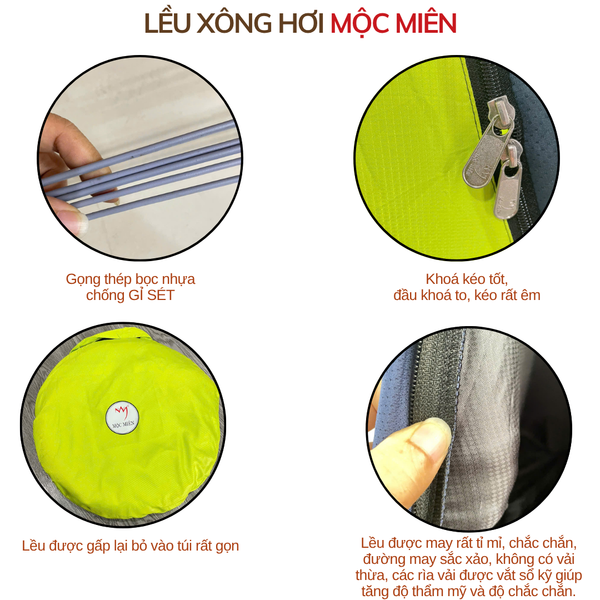 + Khung: gọng thép đàn hồi bọc nhựa (chỉ duy nhất Lều Xông Hơi Loại 1 Mộc Miên mới sử dụng thép bọc nhựa, loại 2 của Mộc Miên hoặc các loại lều trên thị trường hầu hết đều dùng thép ko bọc nhựa để giảm chi phí nếu ẩm ướt sẽ bị sét hoặc gọng nhựa lều co co)